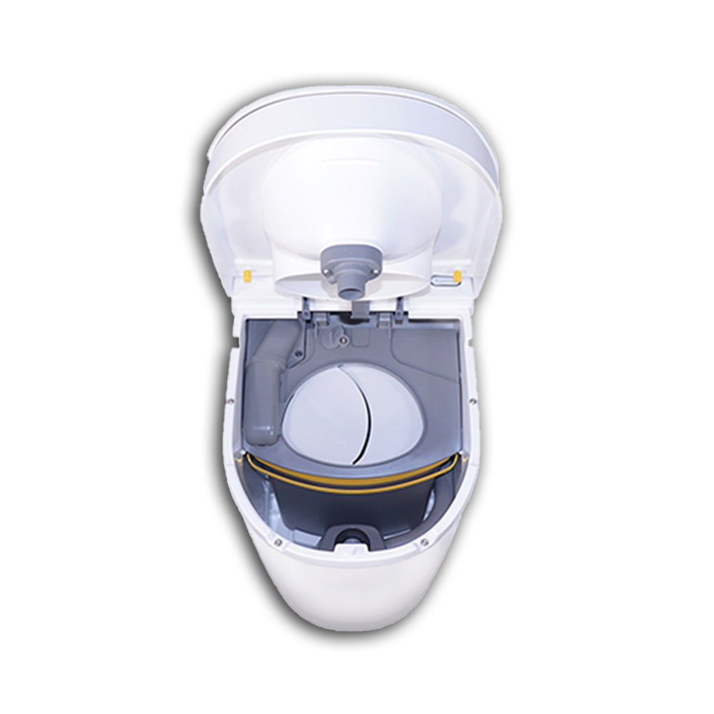 Der Sichtschutz verbirgt den festen Abfall im Behälter und wird zur Seite geschoben, wenn man sich hinsetzt. Dies führt dazu, dass man den Toilettenabfall nur dann sieht, wenn es an der Zeit ist, den festen Abfall zu entleeren.