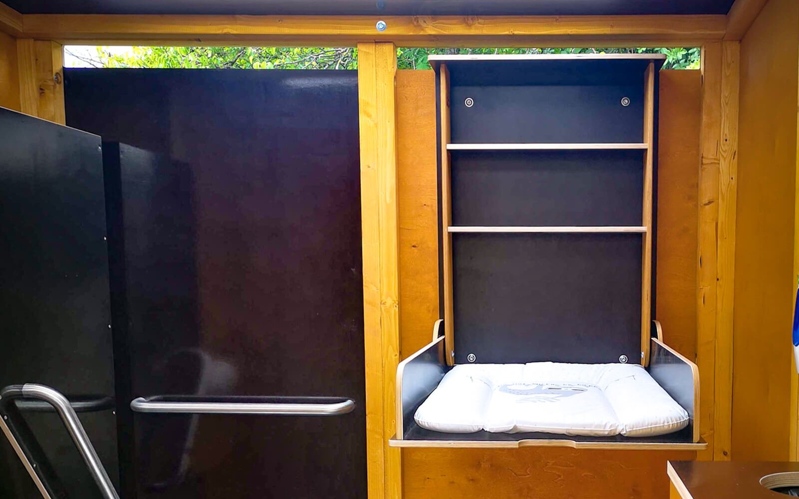 Immer wieder ist es ärgerlich, wenn auf dem Spielplatz kein Wickeltisch zur Verfügung steht. Deshalb haben wir während der Zeiten der Pandemie an unseren Zusatzmodulen gearbeitet und so den ausklappbaren Wickeltisch für unsere Kabinen erstellt.