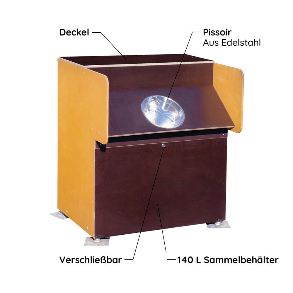 Unser öKlo-Urinal wird regional (in Niederösterreich) aus nachhaltigen Materialien hergestellt, ist kompakt, wetterfest und stabil. Man kann es leicht transportieren und überall rasch aufstellen. Zur Entleerung ist keine Absaugung notwendig.