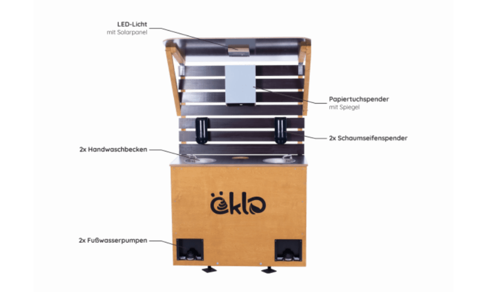 Die öKlo-Waschstation wird mit Solarlicht betrieben, damit bei Dunkelheit niemand im Finsteren tappen muss. Sie umfasst zwei Edelstahlbecken, zwei Wasserpumpen sowie zwei Tanks für Frisch- und Abwasser. Diese fassen 60 Liter – das reicht etwa für 200 Handwäschen.